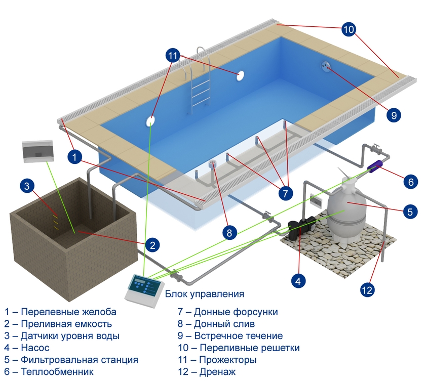 Переливной бассейн – это тип бассейна, в котором, вода находится вровень с кромкой бассейна и вода с поверхности попадает в переливной желоб, расположенный по всему периметру бассейна. Затем вода поступает в накопительную компенсационную ёмкость, а оттуда забирается насосом фильтровальной установки. Накопительная ёмкость оснащена устройством контроля уровня воды, для защиты насоса фильтровальной установки от сухого хода и для поддержания постоянного уровня воды в бассейне путем долива свежей воды. В бассейнах переливного типа, вода, забранная из бассейна, проходит те же этапы, что и в бассейнах скиммерного типа: фильтрация, подогрев и дезинфекция.